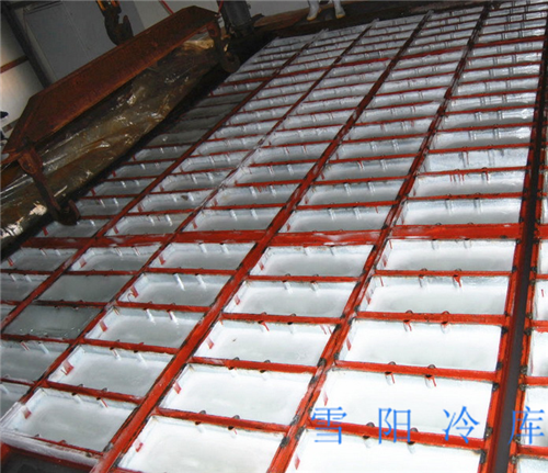 鹽水在鹽水池中被降溫后,在攪拌器的作用下進(jìn)入制冰鹽水池對(duì)冰桶降溫(制冰池設(shè)計(jì)),溫度升高后的鹽水由另一側(cè)流入蒸發(fā)器鹽水池再行冷卻。在鹽水制冰設(shè)備匯總,制冷劑在蒸發(fā)器內(nèi)吸收鹽水的熱量,使鹽水降溫并保持在-10~-14℃左右。當(dāng)冰桶中的水被凍結(jié)后,由吊車依次將冰桶組吊出制冰池放進(jìn)融冰槽融冰,而后利用倒冰架脫水,并經(jīng)滑冰道進(jìn)入冰庫(kù)儲(chǔ)存或直接運(yùn)走。脫水后的空冰桶經(jīng)注水后再放入制冰池中繼續(xù)生產(chǎn),如此循環(huán)。